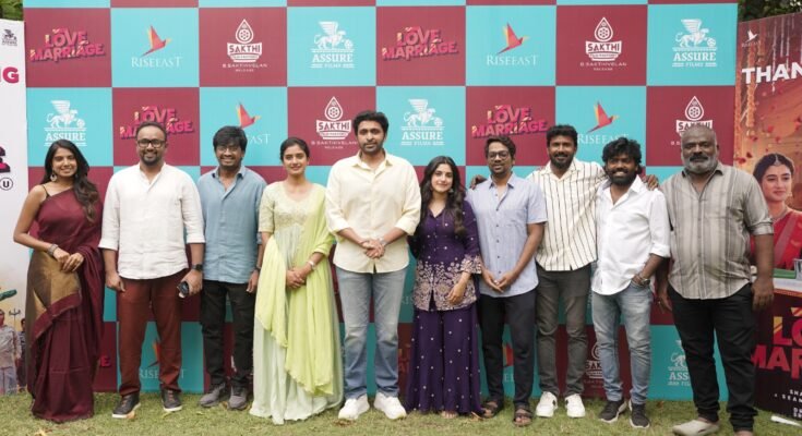 அஸ்யூர் பிலிம்ஸ் மற்றும் ரைஸ் ஈஸ்ட் என்டர்டெய்ன்மென்ட் நிறு வனத்தின் தயாரிப்பில், சக்தி பிலிம் ஃபேக்டரி வெளியீட்டில், அறிமுக இயக்குநர் சண்முகபி ரியன் இயக்கத்தில் விக்ரம் பிரபு, சுஷ்மிதா பட், மீனாட்சி தினேஷ், அருள்தாஸ், ரமேஷ் திலக், முருகானந்தம் உள்ளிட்ட பலரது நடிப்பில் வெளியான ‘லவ் மேரேஜ்’ திரைப்படம் – ரசி கர் களின் பேராதரவுடன் வெற் றிகரமாக திரையர ங்கு களில் ஓடிக்கொண் டிருக்கிறது. இந்நிலையில் படத்தை வெற்றி பெறச் செய்த ரசிகர்களுக்கும், ஊடகத்தினருக்கும் படக்குழு வினர் நன்றி தெரிவிக்கும் வகை யில் விழா ஒன்றினை சென்னையில் ஒருங்கிணை த்திருந்தனர். இவ்விழாவில் படக் குழுவினர் உற்சாகத்துடன் கலந்து கொண்டனர்.