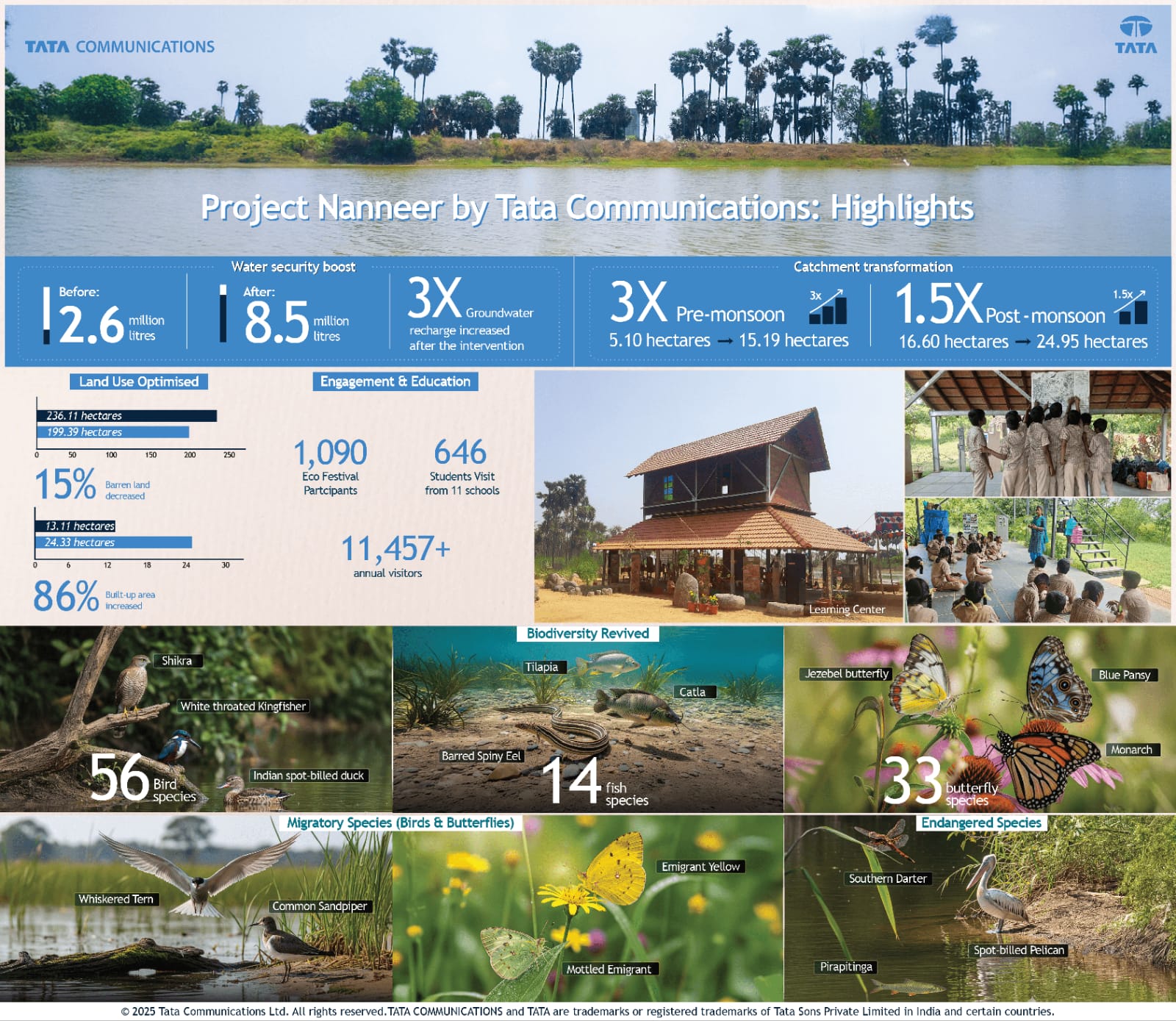 சென்னை, அக்டோபர் 23, 2025:- உலகளாவிய தகவல் தொடர்பு தொழில்நுட்ப நிறுவனங்களில் ஒன்றாக முன்னணி வகிக்கும் டாடா கம்யூனிகேஷன்ஸ் [Tata Communications], பிச்சாண்டிகுளம் வனத்துடன் (Pitchandikulam Forest) இணைந்து, தமிழ்நாட்டின் பொத்தூர் போத்தூர் ஊராட்சியில் உள்ள உப்பரபாளையம் கிராமத்தின் நாகன் தாங்கல் ஏரியை தூர் வாரி சீரமைத்திருக்கிறது. இதன் மூலம் நீண்டகாலமாக பயனற்ற நிலையில் இருந்த நாகன் தாங்கள் ஏரி இப்பொழுது பல்லுயிர்களுக்கான ஒரு செழிப்பான சுற்றுச்சூழலையும், இப்பகுதியிலுள்ள மக்களுக்கு நீர்வள ஆதாரமாகவும் புத்துயிர் பெற்றுள்ளது.