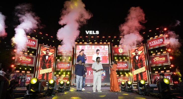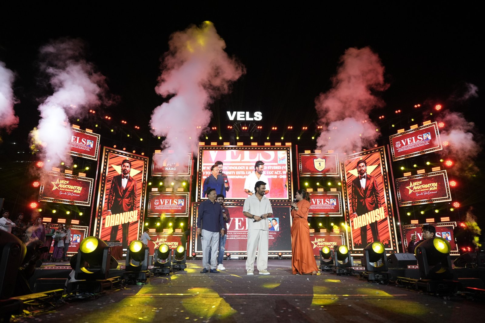 The two-day cultural festival titled VELS Nakshatra 2026 was held at VELS University with great enthusiasm and grandeur. National Award-winning actor Dhanush graced the occasion as the Chief Guest.
