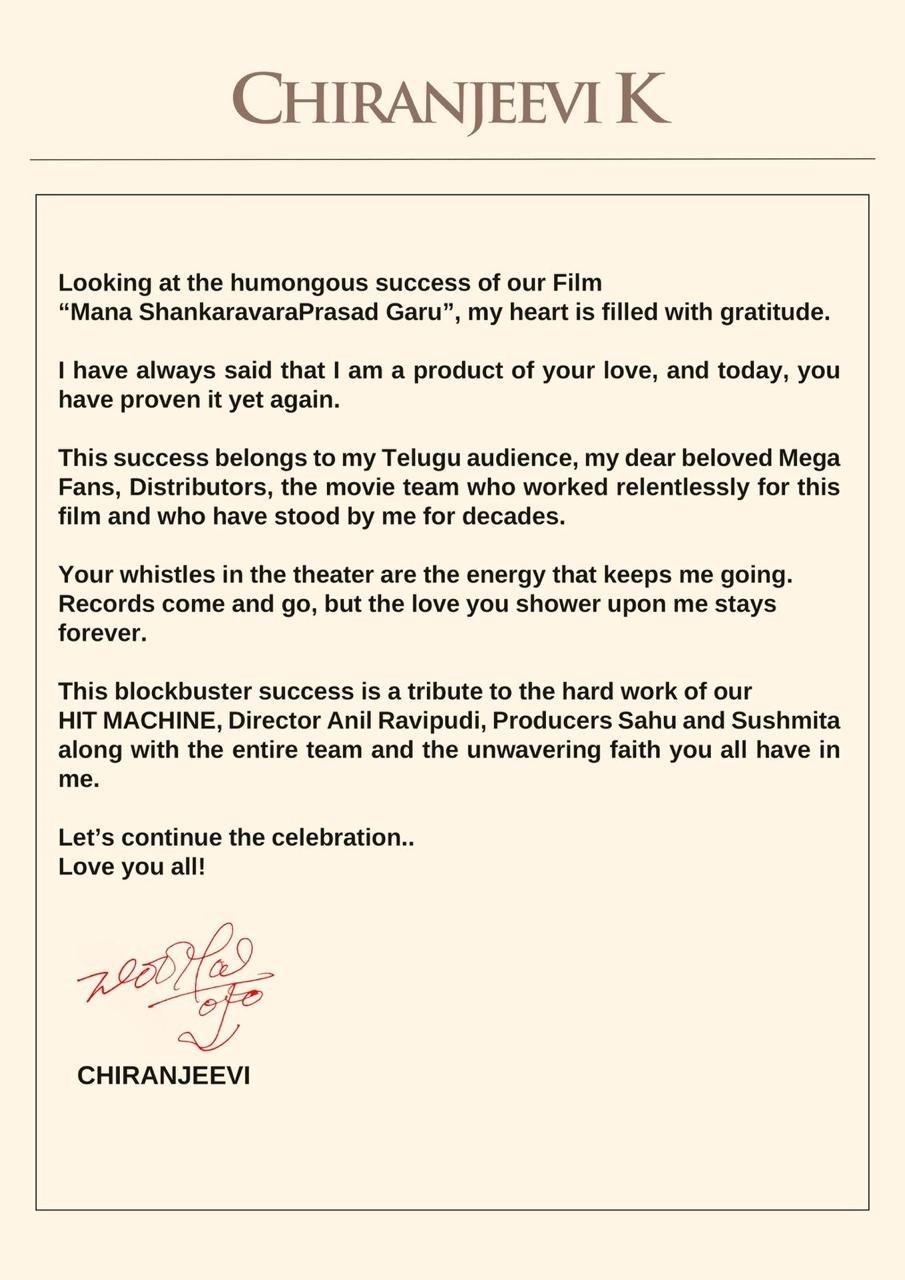 Megastar Chiranjeevi’s message reads: “Looking at the humongous success of our MSG, my heart is filled with gratitude. I have always said that I am a product of your love, and today, you have proven it yet again.