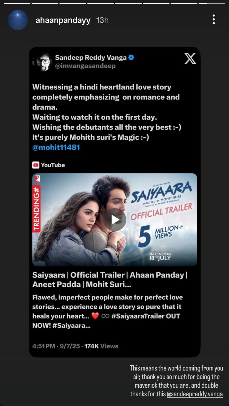 Director Sandeep Reddy Vanga is eager to watch Saiyaara. The Yash Raj Films is produced movie and directed by Mohit Suri. Saiyaara launches Ahaan Panday as a YRF hero. The studio has handpicked Aneet Padda (who stole hearts with her brilliant performance in the much-acclaimed series Big Girls Don’t Cry) as the next YRF heroine. The trailer of the film released earlier this week and Animal director Sandeep Reddy Vanga confessed he’s excited to watch the film.