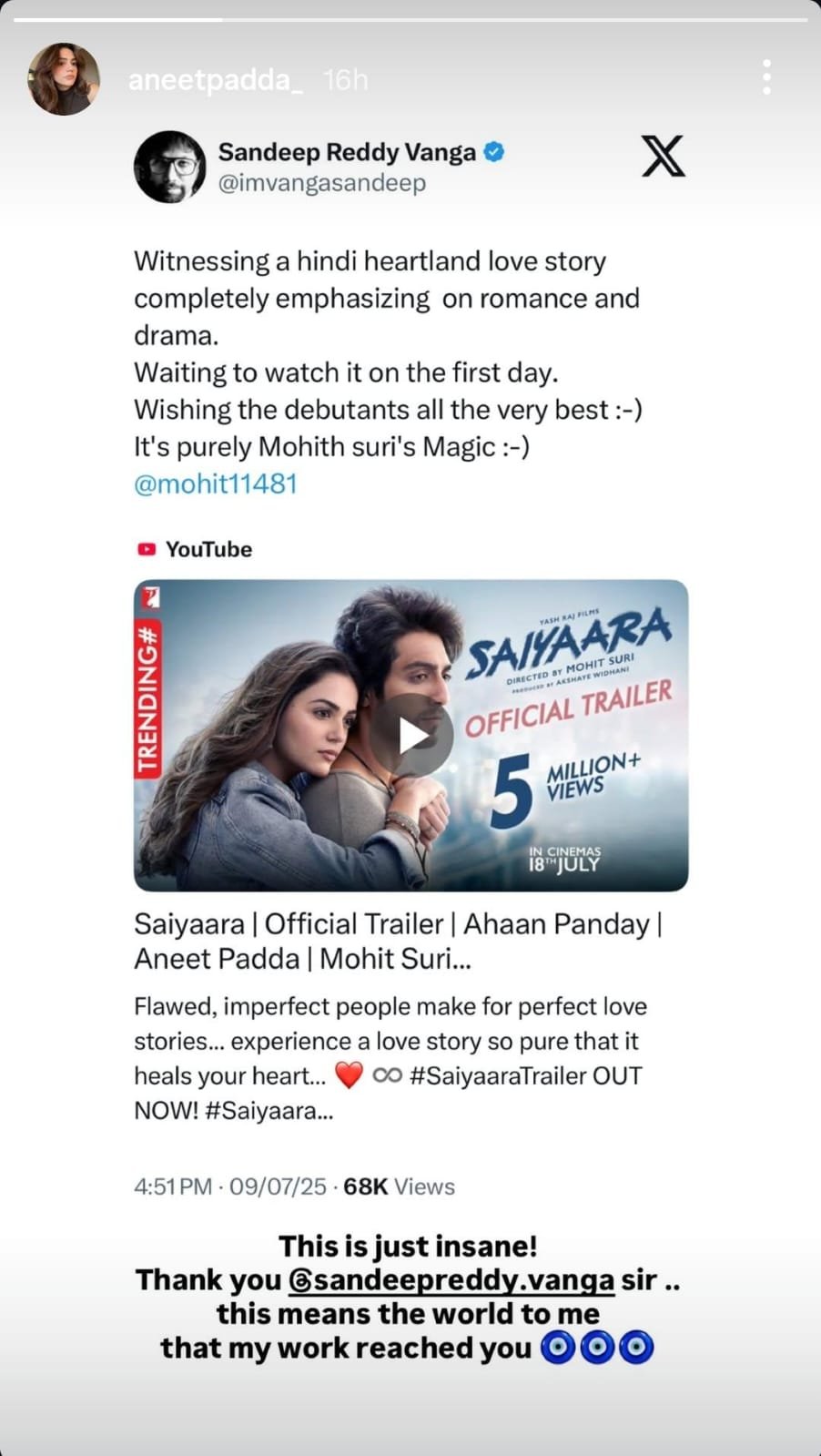 Taking to X, Sandeep shared the trailer and wrote, “Witnessing a hindi heartland love story completely emphasizing on romance and drama. Waiting to watch it on the first day. Wishing the debutants all the very best 🙂 It’s purely Mohith suri’s Magic :-)”.