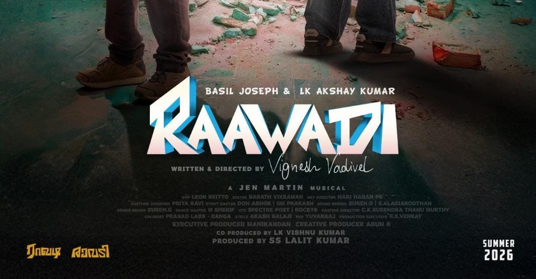 Raawadi, marking the directorial debut of Vignesh Vadivel, features a powerhouse ensemble star-cast including L. K. Akshay Kumar, John Vijay, Sathyan, Jaffer Sadiq, Noble K. James, Arunachaleswaran P.A., Shariq Hassan, and actress Aishwarya Sharma, among others. Adding further star value, leading Malayalam actor Basil Joseph plays a pivotal role in the film.